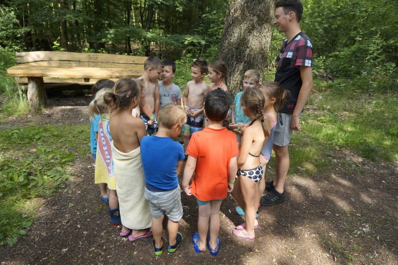 Graag wilde hij de omgeving verkennen, maar hij moest van zijn moeder mee op "zwembroeken jacht". Een nieuwe zwembroek hield hem dus tegen om zelf op pad te gaan.